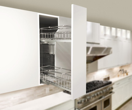 Размер: Ширина модуля - 150 мм Бутылочница в верхнюю базу BELLA UP – аккуратная и практичная выдвижная корзина, предназначенная для установки в верхние модули кухонного гарнитура. Этот продукт позволит повысить эргономичность кухни и сделать хранение более организованным. В KR35 удобно расположить баночки со специями, бутылочки с уксусом, маслами и соусами – иными словами все, что необходимо иметь под рукой во время готовки или хранить вдали от детей. Среди безусловных преимуществ BELLA UP – высокое качество ее исполнения. Корзина комплектуется современными направляющими скрытого монтажа, которые обеспечивают стабильный, бесшумный ход и плавное доведение. Прутки корзин выверены до миллиметра, чтобы сохранить в целости доверенные продукты. К тому же бутылочнице не вредит агрессивная среда кухни и влажный воздух, поскольку она обладает гальваническим покрытием и защищена от коррозии. BELLA UP составит безупречный тандем для бутылочницы в нижнюю базу BELLA KR25. Корзины в паре смотрятся очень гармонично, и в дуэте создают модный и нестандартный вариант организации кухонного гарнитура по разумной стоимости.